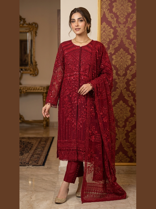 Step into elegance with this deep maroon masterpiece from Baroque. A testament to high-end Pakistani craftsmanship, this 3-piece suit features a rich interplay of tonal embroidery and shimmering sequins on a premium chiffon base. Designed for formal sophistication, it offers a regal silhouette perfect for weddings and festive evening wear.