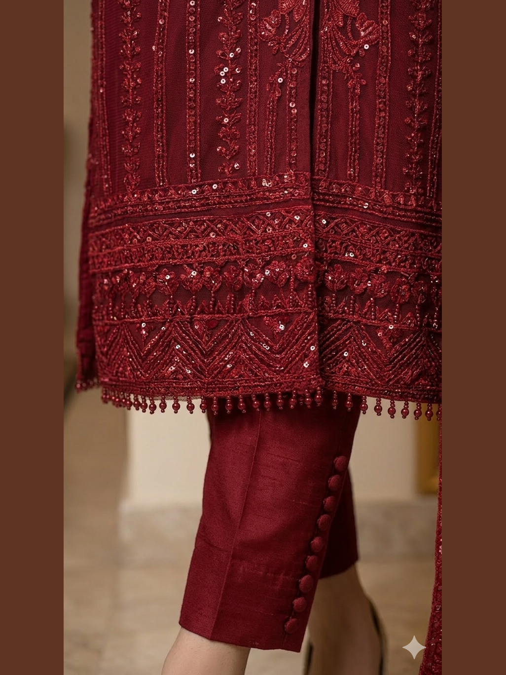 Embellishments: Tonal threadwork, micro-sequins, and bead (pearl) drop finishing.