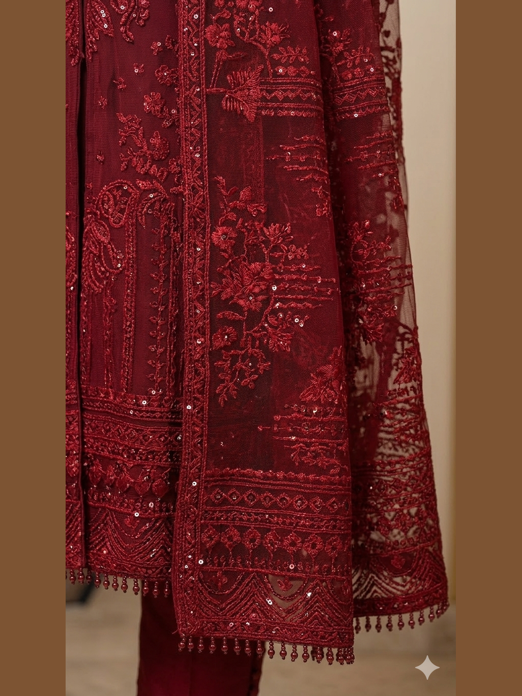 - Shirt: Premium Embroidered Chiffon front, back, and sleeves. Features a round neckline with a full-length fabric-covered button-down placket and handcrafted bead tassels on the sleeves and hem.