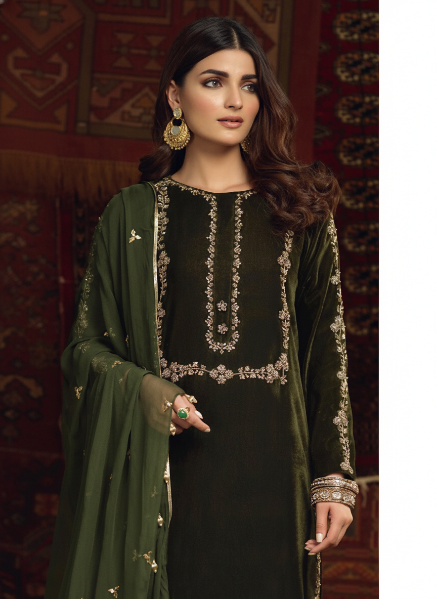 Nageen is a sophisticated velvet shirt inspired by the charm of jewels. Heavy decoration of kora, dabka, aari, Zari and gems, along with a boat neckline and sleeves with a straight split for a glamorous look makes this one of the best Pakistani Designer Clothes. It is a jade green matching chiffon dupatta with hand adornments and banarsi pants are provided along with this suit. The art and style combined with the green hue give this suit truly look like a gem.