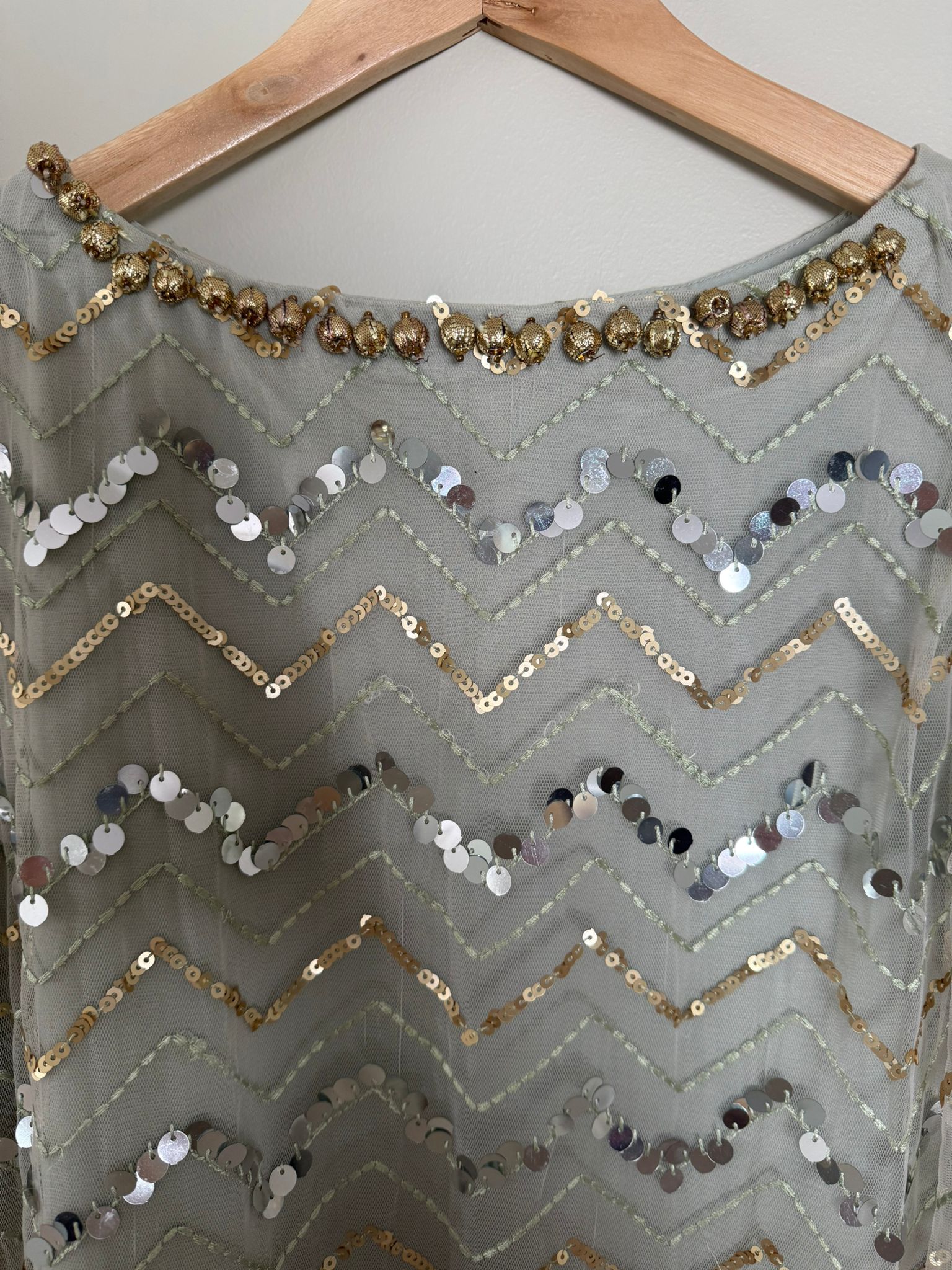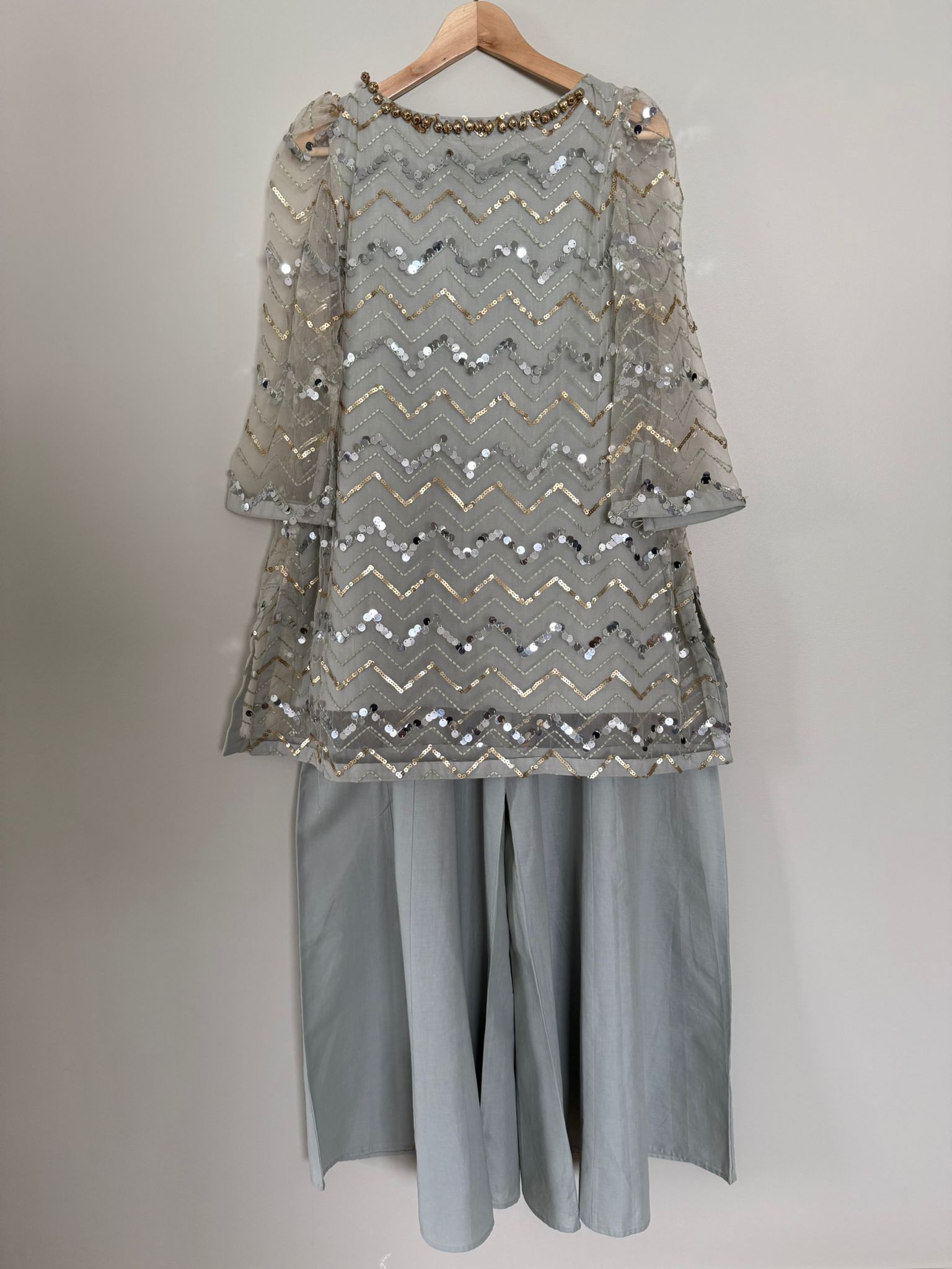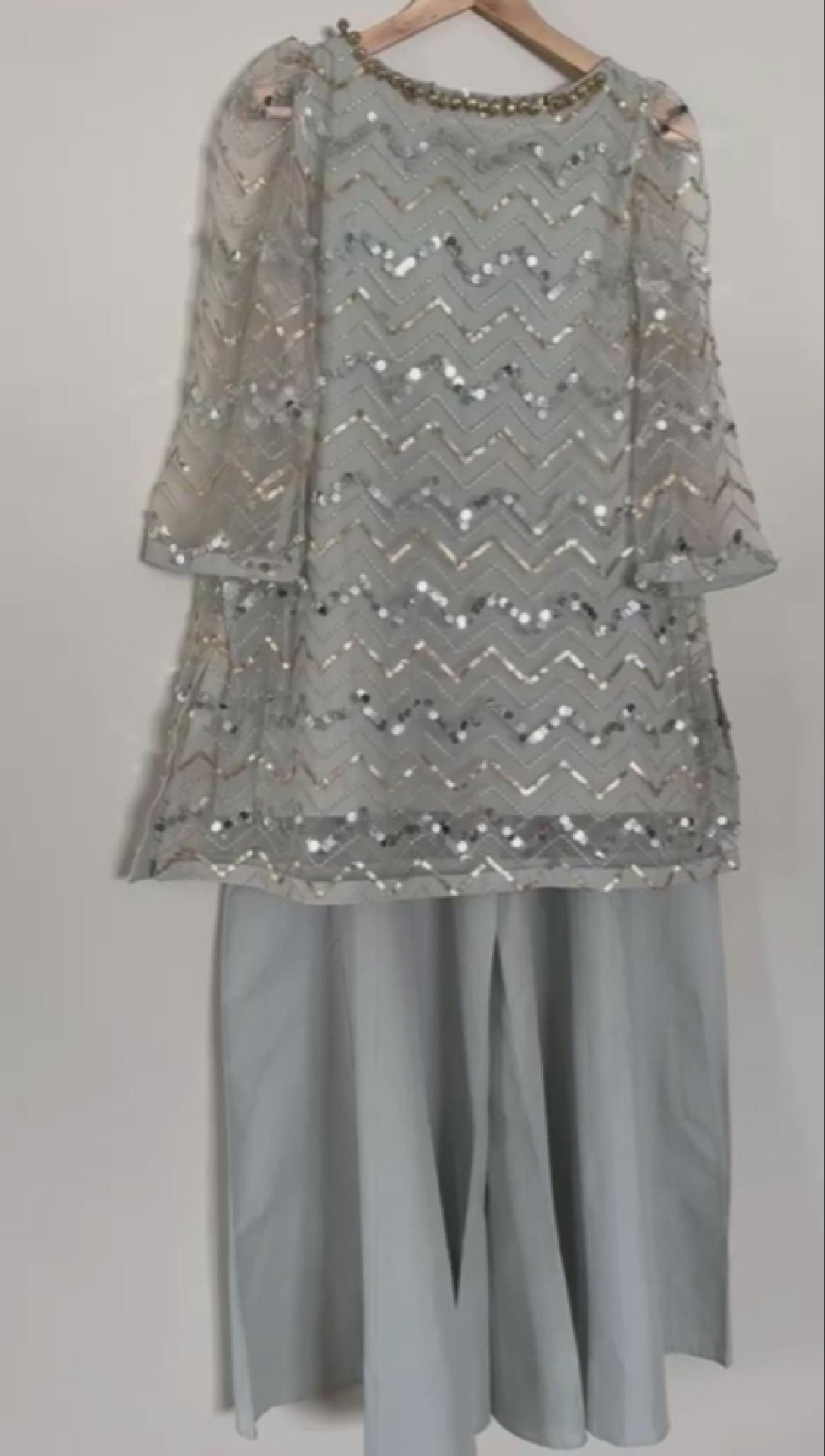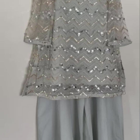 This elegant Ethnic dress features a beautiful light grey net top adorned with intricate gold and silver sequin work in a chevron pattern. The shirt has a round neckline with a delicate beaded embellishment and stylish flared sleeves. It is paired with matching light grey flowy trousers, creating a graceful and sophisticated look perfect for a festive occasion or celebration.
