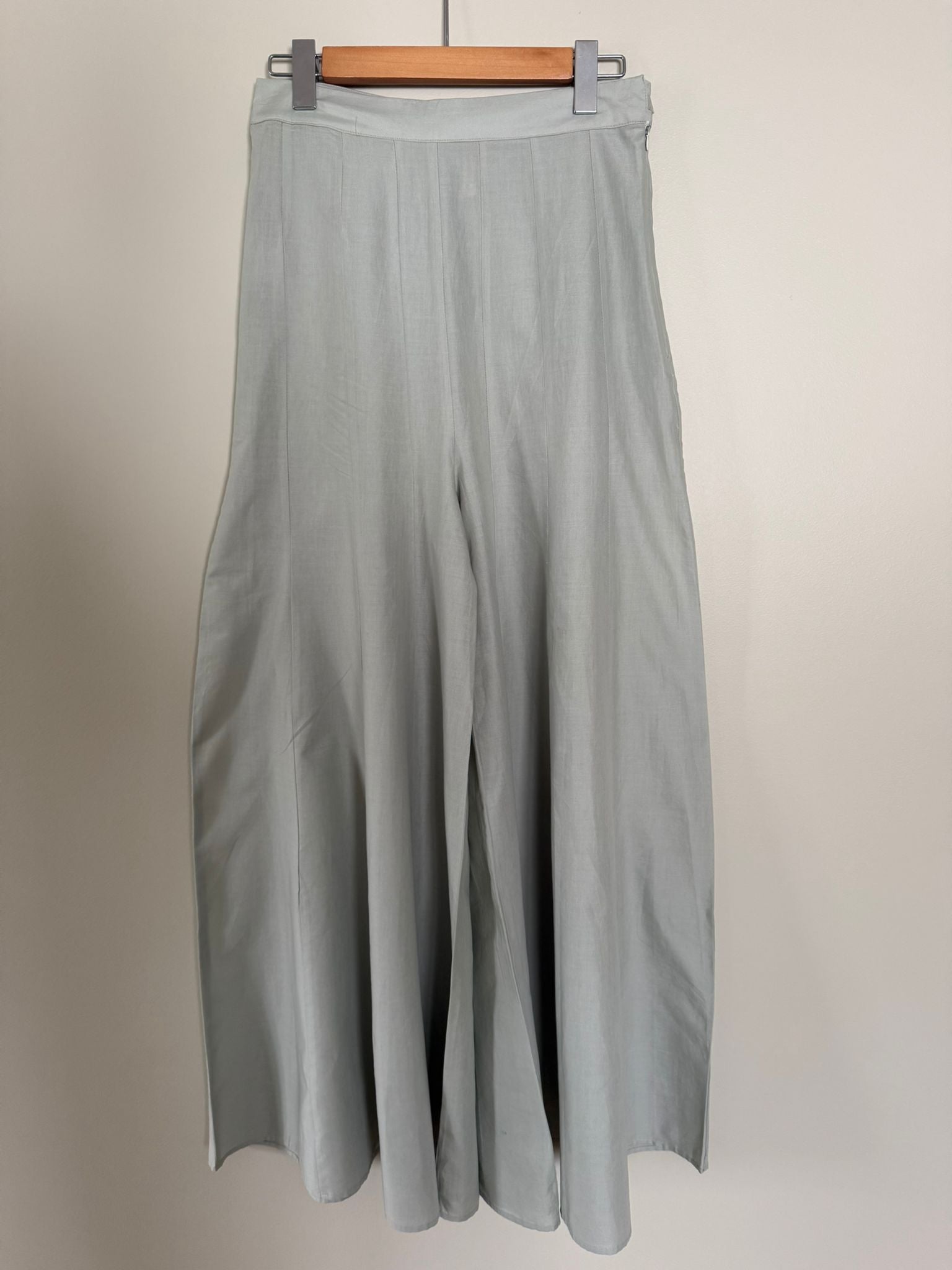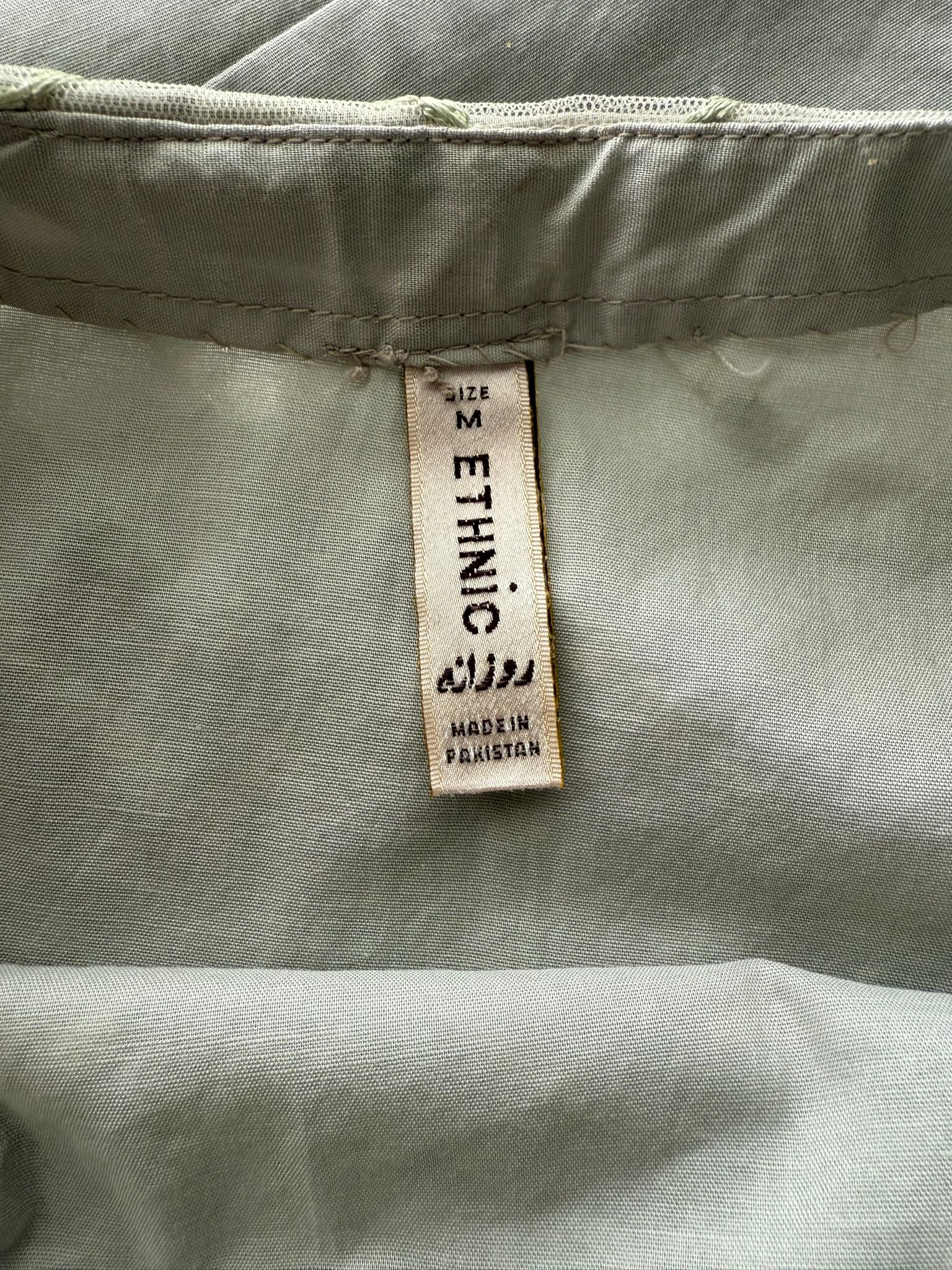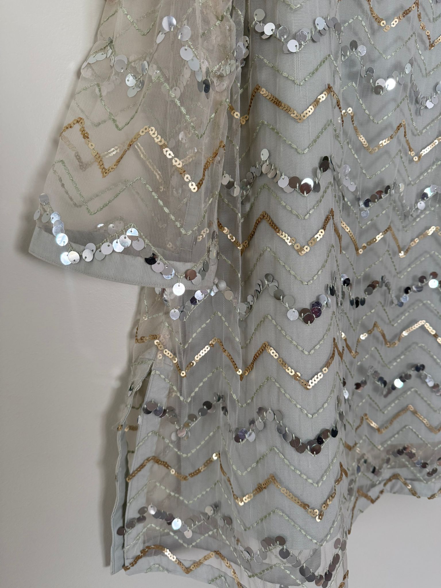 This elegant Ethnic dress features a beautiful light grey net top adorned with intricate gold and silver sequin work in a chevron pattern. The shirt has a round neckline with a delicate beaded embellishment and stylish flared sleeves. It is paired with matching light grey flowy trousers, creating a graceful and sophisticated look perfect for a festive occasion or celebration.